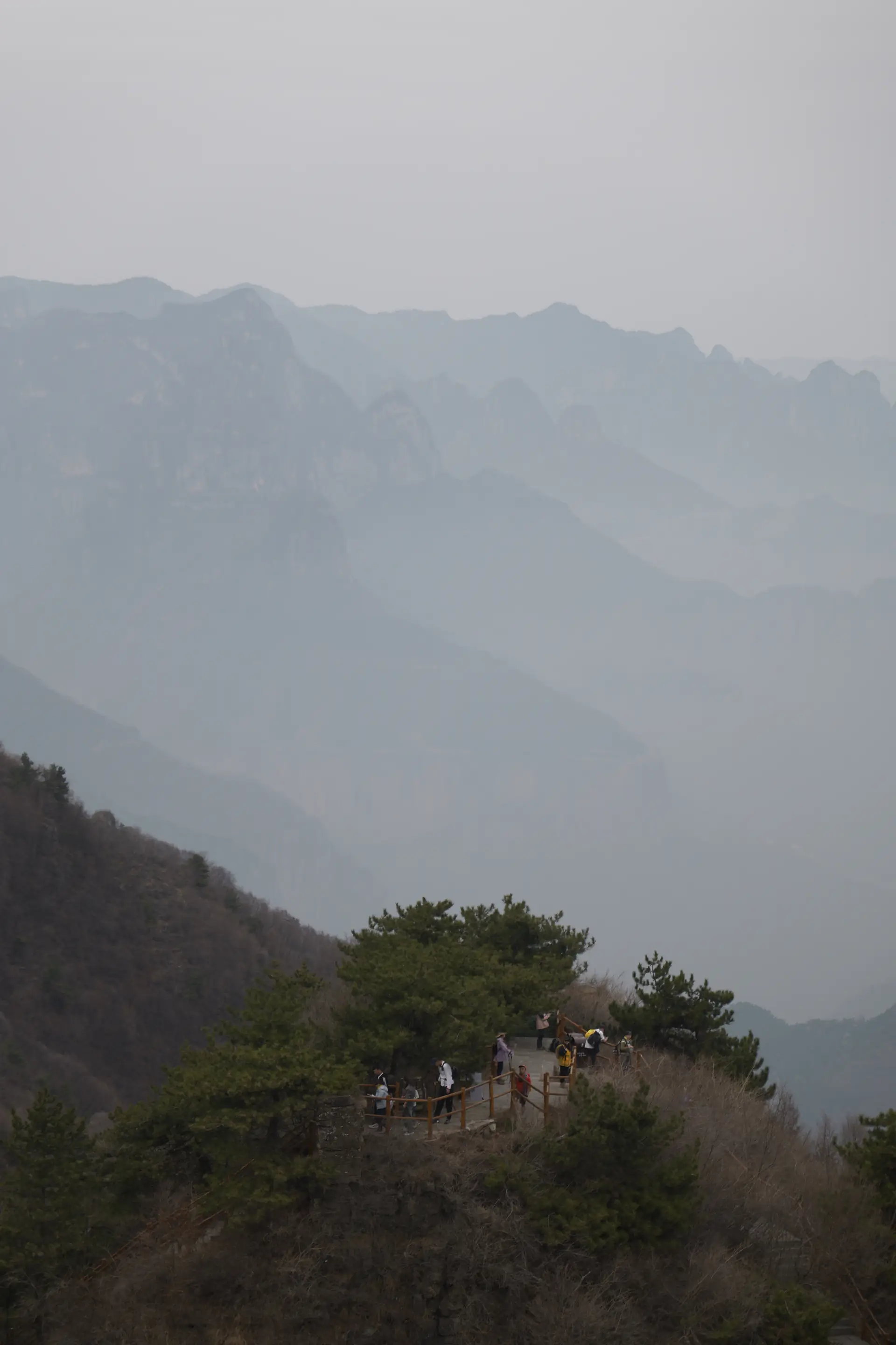 山顶,一览群山,置身水墨画的意境中。海拔到了 1600m,植被也以松树为主: