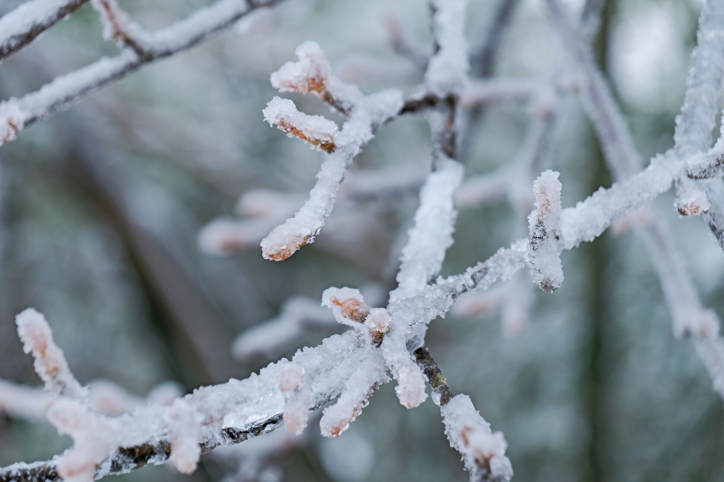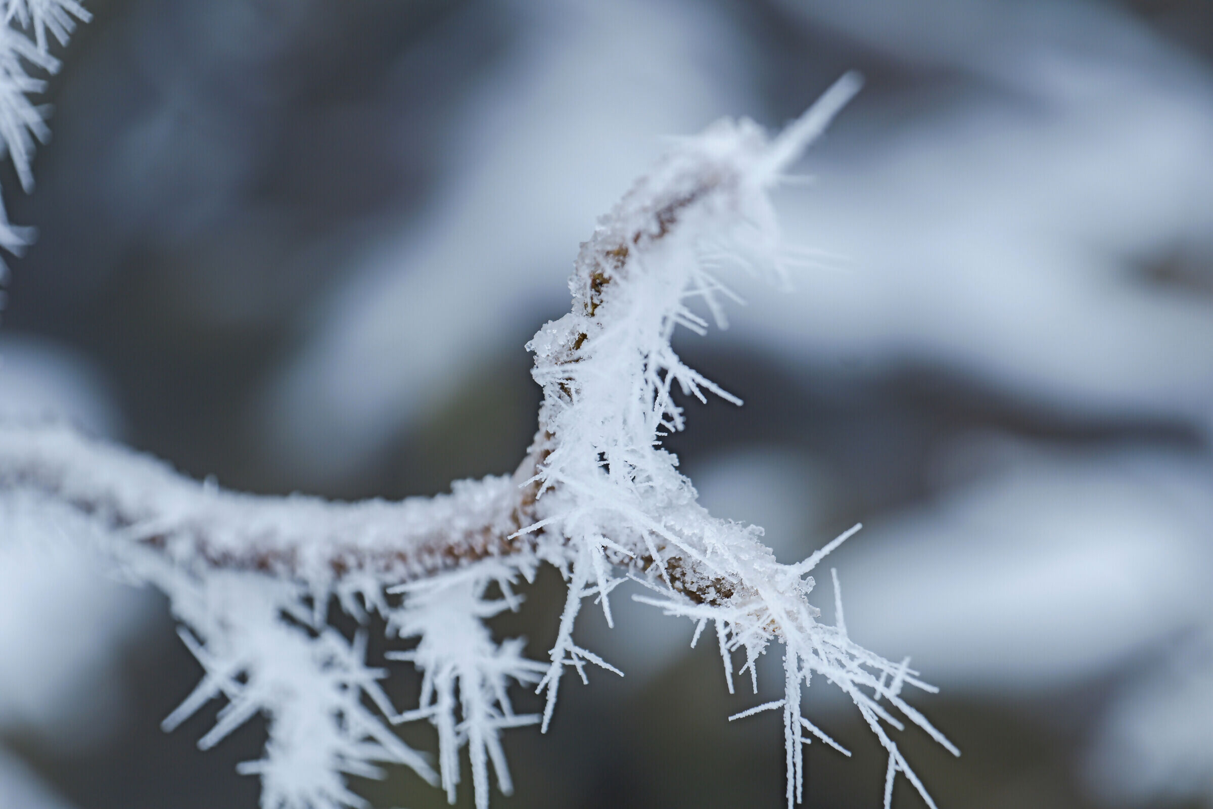 不被打扰的雪凝结成了冰晶,未开春的树枝上、刚准备盛放的花朵上、被风吹歪但没缓过神来的树叶上都有。